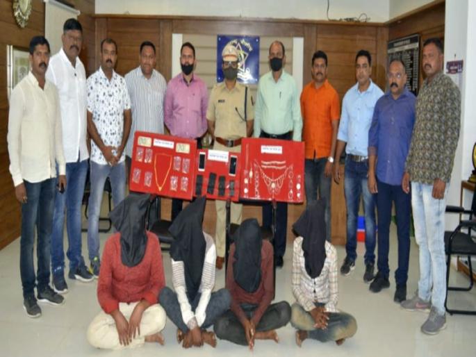 धुळे : शिरपूरसह परिसरात चोरी केल्यानंतर लपून बसणे, वारंवार ठिकाण बदलणे यामुळे चोरटे पोलिसांना सापडत नव्हते़ अशातच धुळ्यानजिक तिखी तलावाजवळ तीन जण लपून बसले असल्याची माहिती स्थानिक गुन्हे शाखेला मिळताच त्यांच्या मुसक्या आवळण्यात आल्या़ त्याचवेळेस चोरीचे सोने विकत घेऊन जळगावच्या दिशेने निघालेल्या व्यापाऱ्याला पारोळा चौफुलीवर पकडण्यात पोलिसांना यश आले़ त्यांच्याकडून ४ लाख ८७ हजाराचा मुद्देमाल हस्तगत करण्यात आले़मध्यप्रदेशातील बडवानी जिल्ह्यातील सेंधवा तालुक्यातील मोहाला येथील काही लोकं धुळे जिल्ह्यातील शेतावर जागल्याचे काम करतात़ त्यांच्याकडे त्यांचे काही नातेवाईक पाहुणे म्हणून येतात, चोरी करुन निघून जातात़ मोहाला येथील दोघांनी त्यांच्या साथीदारांच्या मदतीने शिरपूर तालुक्यातील करवंद, वाघाडी आणि अर्थे गावात घरफोडी केल्याची गोपनीय माहिती स्थानिक गुन्हे शाखेचे पोलीस निरीक्षक शिवाजी बुधवंत यांना मिळाली़ पण, चोरट्यांना सुगावा लागल्याने ते पळून जाण्यात यशस्वी ठरले़ धुळे तालुक्यातील नरव्हाळ येथील एक शेताजवळील तिखी तलावालगत तीन जण लपून बसल्याची माहिती बुधवंत यांना मिळताच त्यांच्यासह उपनिरीक्षक हनुमान उगले, हेड कॉन्स्टेबल संजय पाटील, रफिक पठाण, श्रीकांत पाटील, महेंद्र कापुरे, कर्मचारी प्रभाकर बैसाणे, कुणाल पानपाटील, गौतम सपकाळे, उमेश पाटील, रविकिरण राठोड, विशाल पाटील, किशोर पाटील, तुषार पारधी, मयूर पाटील, योगेश जगताप, दीपक पाटील, कैलास महाजन यांनी सापळा लावून पाठलाग करुन तिघांच्या मुसक्या आवळल्या़ पोलिसांनी जतन रुमसिंग मोरे (२१), कुंवरसिंग सुरसिंग मोरे (२२) आणि लालसिंग रेन्या तडवी (२०) (तिघेही रा़ मोहाला ता़ सेंधवा जि़ बडवानी) यांना ताब्यात घेऊन पोलिसी खाक्या दाखविताच दागिने, मोटारसायकल काढून दिले आहे़ त्यांनी चोरीचे सोने हे सोनू उर्फ जितेंद्र अशोक सोनार (३०, रा़ मेहरुण, ता़ जळगाव) याला विकल्याचे सांगितले़ त्याचा शोध घेतला असता पारोळा चौफुलीवरच पकडण्यात आले़ त्याच्याकडून ४ लाख ८७ हजार ५२३ रुपयांचा मुद्देमाल जप्त करण्यात आला़२०१८ मध्ये धुळे तालुक्यातील नेर येथे जैन मंदिराची दानपेटी फोडून चोरट्यांनी ऐवज लांबविला होता़ ही चोरी केल्याची कबुली संशयित जतन रुमसिंग मोरे याने दिल्याची माहिती पोलीस निरीक्षक शिवाजी बुधवंत यांनी दिली़ दरम्यान, पकडण्यात आलेल्या चौघा आरोपींना शिरपूर पोलिसांच्या ताब्यात देण्यात आले आहे़