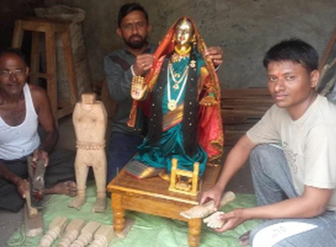 लोकमत न्यूज नेटवर्कवर्शी : खान्देशात श्रावण महिन्यातील रविवारी ठिकठिकाणी कानुमातेची स्थापना करण्यात येते. हा उत्सव जवळच येऊन ठेपल्याने येथील कारागिरांनीही कामाला वेग दिला आहे. येथे कुठल्याही अत्याधुनिक मशिनरीचा वापर न करता लाकडावर कोरीव काम करुन कानुमातेची मूर्ती साकारली जाते.गावातील सुतार काम करणारे प्रकाश दगा सुर्यवंशी हे लाकडावर कोरीव काम करुन कानुमातेची साकारतात. त्यांना मूर्ती बनविण्यासाठी किमान ८ ते १० दिवस लागतात. मूर्ती घडविण्यासाठी सुमारे ५ ते ६ हजारापर्यंत खर्च येतो. सर्व सजावटीसह १२ ते १३ हजारापर्यंत खर्च होतो. मूर्तीवर चढविलेला श्रृंगार लक्ष वेधून घेतो. मूर्ती बनवायची असल्याने भाविकांना किमान एक ते दीड महिना अगोदर सांगावे लागते. त्यांनी घडविलेल्या मूर्ती साक्री, शिरपूर, शिंदखेडा, यावल, पारोळा तालुक्यात गेल्या आहेत.