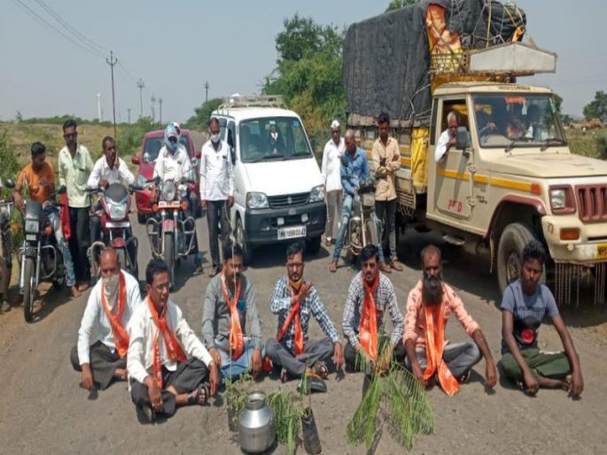 खड्डयांमध्ये झाड लावून मनसेतर्फे धुळे जिल्ह्यातील जैताणे रस्त्यावर आंदोलन