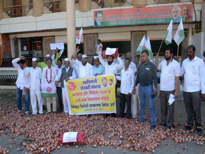 धुळे : कांद्याला २ हजार ३०० रुपये हमी भाव मिळावा, अशी मागणी करत स्वाभिमानी शेतकरी संघटनेच्यावतीने शुक्रवारी केेंद्रीय संरक्षण राज्यमंत्री डॉ़ सुभाष भामरे यांच्या धुळ्यातील कार्यालयासमोर कांदा रस्त्यावर फेकून आंदोलन केले़ लक्षवेधी ठरलेल्या आंदोलनाची दिवसभर चर्चा होती़