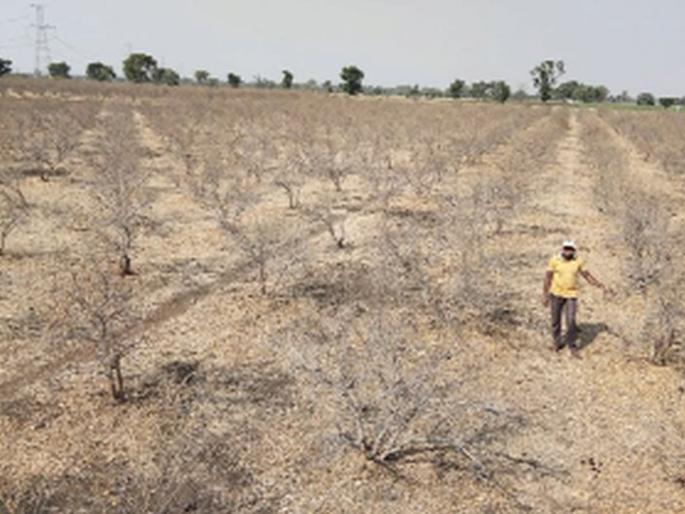 मालपूर : शिंदखेडा तालुक्यातील मालपूर परिसरातील डाळींबाची बाग पाण्याअभावी करपून गेली आहे. यावर्षी उन्हाने उच्चांक गाठल्याने उष्णतेमुळे बाग पुन्हा बहरेल, याची शक्यताही उरलेली नाही. दुष्काळाच्या झळांची तीव्रता मालपूरसह परिसरात दिवसेंदिवस वाढत असून हा दुष्काळ चारा, पाण्यापुरता मर्यादित राहिला नसून जीवापाड जपलेल्या शेत शिवारातील बागा देखील उद्ध्वस्त करीत असल्याचे चित्र दिसून येत आहे.दोंडाईचा-मालपूर रस्त्याच्या आजुबाजूला मालपूर शिवारातील डाळींब बाग, आवळा बाग व सिताफळ बाग पाण्याअभावी नुसत्या करपल्याच नाहीत तर सुकून गेल्या आहेत. पाण्याचा प्रश्न मालपूरसह परिसरातील गावांमध्ये गंभीर झाला आहे. याचा फटका आता दिर्घमुदतीच्या फळबागा पिकांपर्यंत येऊन पोहाचल्यामुळे शेतकरी वर्ग हवालदिल झाला आहे. रानावनात जनावरांचा चारा संपुष्टात आल्याने शेतकरी आधीच हैराण झाले आहे. त्यात वर्षानुवर्ष उत्पन्न मिळवून देणाºया फळबागा देखील डोळ्यादेखत उन्हामुळे खाक झाल्यामुळे आता शेती करायची उमेदच शिल्लक राहिली नसल्याची प्रतिक्रीया शेतकºयांकडून व्यक्त होत आहे.यावर्षी तुलनेने कमी पाऊस झाला. आॅगस्ट महिन्यातील दोन दिवसाचा पाऊस सोडला तर त्यानंतर पाण्याचा थेंबही पडला नाही. गेलेला पाऊस पोळ्याला हमखास येतो, असे अनुभवी शेतकरी सांगतात. मात्र, यंदा ही अपेक्षाही फोल ठरल्यामुळे विहिरींना पाणीच आले नाही. ओहोळ, लहान मोठे जलयुक्त बंधारे दोन वर्षांपासून कोरडे आहेत. तसेच अमरावती मध्यम प्रकल्पात १४ वर्षांपासून ठणठणाट आहे.शेतकºयांनी सुमारे पाच वर्षांपूर्वी शेकडो हेक्टरवर डाळींब, सिताफळ, आवळा बागांची लागवड करुन जोपासना केली होती. मात्र, यावर्षीच्या दुष्काळात या बाग वाळून गेल्यामुळे शेतकºयांचे लाखो रुपयांचे नुकसान झाले आहे. शेतकºयांनी अगोदर टँकरद्वारे पाणी देऊन या बागा जगविण्याचा प्रयत्न देखील केला. मात्र, टँकर भरुन आणणे देखील आता शक्य नसल्याने नाईलाजस्तव सोडून द्यावे लागत आहे. डाळींबास कळी लागली. मात्र, डाळींब तयार होण्यास सुरुवात होताच पाणी कमी पडल्याने फळांसह बागा सुकून गेल्या, असे शेतकयांनी सांगितले.
