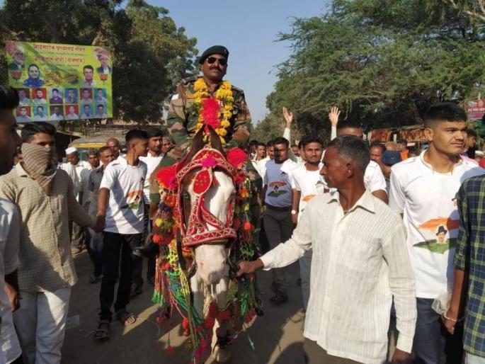 आॅनलाइन लोकमतमालपूर (जि.धुळे)-सैन्य दलातून निवृत्त झालेल्या जवानाची ग्रामस्थांनी घोड्यावरून मिरवणूक काढली.मालपुर येथील जवान आनंदा पावबा देवरे (माळी) हे नुकतेच सैन्य दलातून निवृत्त झाले. याचे औचित्य साधुन मालपूर गावातील बॉर्डर ग्रुप सह ग्रामस्थांतर्फे त्यांची गावातून घोड्यावरून मिरवणूक काढत जल्लोषात त्यांचे स्वागत करण्यात आले. या स्वागताने जवान आनंदा माळी हे भारावले. त्यांची बसस्थानकापासून घोड्यावरून मिरणूक काढण्यात आली ढोल-ताशांच्या गजरात त्यांचे स्वागत करण्यात आले. सायंकाळी डॉ.बाबासाहेब आंबेडकर चौकात सत्कार सन्मान सोहळा घेण्यात आला या सोहळ्याला दोंडाईचाचे प्राचार्य डी.एन.जाधव, हस्ती स्कूलचे चेअरमन कैलास जैन, मालपूरचे सरपंच मच्छिंद्र पारधी, कैलास माळी, हेमराज नाना पाटील, श्रावण अहिरे, बापू महाराज उपस्थित होते. यशस्वीतेसाठी योगेश्वर माळी,सचिन सोनवणे,इम्रान मण्यार,विलास इंडवे,ज्ञानेश्वर माळी,रोहित भामरे,विलास माळी, अविनाश ठाकूर, आदींनी परिश्रम घेतले.
