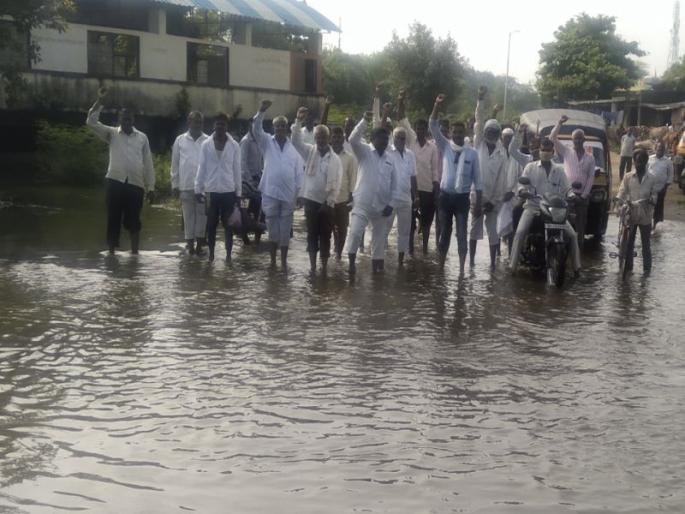 आॅनलाइन लोकमतवडजाई (जि.धुळे) : तालुक्यातील बाभुळवाडी गावात प्रवेश करण्यापुर्वी किंवा गावाबाहेर जाताना फरशी पुलावरिल पाण्यातुनच यावे लागते. या पुलाची उंची वाढवावी या मागणीसाठी ग्रामस्थांनी मंगळवारी पाण्यात उभे राहून आंदोलन केले.धुळे शहरापासुन अवध्या दहा ते बारा किलोमिटर अंतरावर बाभुळवाडी हे सुमारे तीन हजार लोकवस्तीचे गाव आहे. गावात प्रवेश करण्याआधी एक मोठा नाला आहे. त्या नाल्यावर २५ वर्षांपूर्वी फरशी पुल बाधण्यात आला होता, तो आता जीर्ण झाला आहे. पुलाच्या मध्य बागी मोठमोठे खड्डे पडले आहेत. सध्या या नाल्याला भरपुर पाणी आले आहे. पुलावरून पाणी वाहत आहे. फरशीला पुलाला दोन्ही बाजुने कठडे नाहीत . पुलावरून जाताना तोल गेल्यास खाली पडण्याची भीती आहे. याच रस्त्यावरून शाळेची लहान मोठी मुले ये-जा करीत असतात. अनेकदा शासनस्तरावर निवेदन दिले आहेत पंचायत समितीच्या विकास आराखडयात पुलाचा समावेश करण्यात आला आहे. परंतु अधिकाऱ्यांच्या दुर्लक्षामुळे ग्रामस्थांच्या जीवाला धोका निर्माण झाला आहे.या नाल्यावरील पुलाची उंची वाढवावी या मागणीसाठी येथील पंचायत समिती सदस्य भाऊसाहेब देसले, सरपंच किरण पवार, जे.के.वाघ, साहेबराव देवरे, अशोक पवार, राजेद्र पाटील, रघुनाथ पाटील, भगवान पाटील, धनराज पाटील, हरि पवारआदिनी पुलावरिल वाहत्या पाण्यात उभे राहुन आदोलन केले आहे.