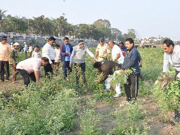 धुळे : स्वच्छ सर्वेक्षण २०२० च्या मानाकंन प्राप्त करण्यासाठी पांझरा नदीपात्राची स्वच्छता करण्यात आली़ शनिवारी सकाळी कडाक्याच्या थंडीत सुमारे १ हजार ६०० विद्यार्थी, सामाजिक संस्थेचे प्रतिनिधी तसेच अधिकारी व कर्मचाऱ्यांनी स्वच्छता मोहिमेत सहभाग नोंदविला होता़याप्रसंगी उपमहापौर कल्याणी अंपळकर, स्थायी समिती सभापती युवराज पाटील, महिला बालकल्याण सभापती निशा पाटील उपस्थित होते. कार्यक्रमाप्रसंगी आयुक्त अजिज शेख यांनी स्वच्छतेची शपथ देऊन नदी पात्र स्वच्छता मोहिमेस प्रारंभ केला. यावेळी पाटी, पावडी, झाडु, बादली आदी साहित्यांसह पोलीस प्रशिक्षण केंद्रातील २०० पोलीस महिला कर्मचारी ड्रेसकोडसह सहभागी झाल्या. याशिवाय मोहिमेत एन.सी. सी, एनएसएस, स्काऊट गाईडचे विद्यार्थी, अधिकारी व कर्मचाºयांनी स्वच्छतेच्या घोषणा देत स्वच्छतेविषयी जनजागृती केली़याठिकाणी राबविली माहिमशनिवारी सकाळी ७ ते १० वाजेदरम्यान पांझरा नदीपात्रात स्वच्छता मोहिम राबविण्यात आली़ या मोहिमेत हजारो धुळेकरांनी सहभाग नोंदविला़सिध्दीविनायक गणपती मंदिर ते लहानपुल या परिसरातील पांझरा नदीकाठावरील दोन्ही बाजुच्या गवत, कचरा, पुजेचे साहित्य नष्ट करण्यात आले.३५ टन कचरा संकलनमोहिमेसाठी ४ जेसीबी, २ डंपर, १२ ट्रॅक्टरद्वारे नदीपात्राची स्वच्छता करण्यात आली़ यावेळी नदीपात्रातून प्लास्टीक, टाकाऊ पदार्थ, कचरा गोळा करण्यात आला़ तसेच मलेरिया विभागामार्फेत नदीच्या दोन्ही बाजुस व जमा झालेल्या पाण्यात रसायन फवारणी केली़यांचा होता सहभागइनरव्हिल, सप्तश्रृंगी, इंदिरा महिला मंडळ संचलित परदेशी शाळेचे शिक्षक व पदाधिकारी, पोलिस प्रशिक्षणचे प्राचार्य बच्छाव, आरपीआय चौधरी, उपायुक्त गणेश गिरी, नगरसेविका प्रतिभा चौधरी, लक्ष्मी बागुल, वंदना मराठे, धनराज पाटील, आरोग्याधिकारी डॉ़ महेश मोरे, सिमा मराठे, धनराज पाटील, अभियंता कैलास शिंदे, मनपा शिक्षण मंडळ प्रशासन अधिकारी महेंद्र जोशी, नारायण सोनार, चंद्रकांत जाधव, लक्ष्मण पाटील आदी उपस्थित होते़ कार्यक्रमाचे सुत्रसंचलन वाहिदअली सैय्यद, मनोज वाघ, अनिल साळूंखे यांनी केले. शहरातील मोहम्मदीया उदु, कानुश्री, पटेल हायस्कूल, गरूड हायस्कूल, मनपा शाळा २०, स्वामी टेऊराम, महाराणा प्रताप, कमलाबाई कन्या शाळा, घासकडबी महाविद्यालय, न्यू़ सिटी शाळेच्या विद्यार्थ्यांनी श्रमदान केले.