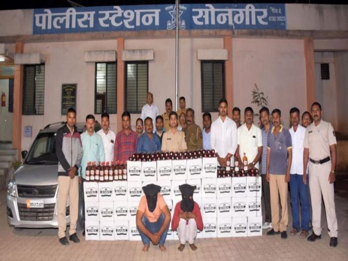 सोनगीर : येथील पोलिसांनी सापळा रचून शुक्रवारी दुपारच्या सुमारास मुंबई-आग्रा महामार्गावरील देवभाने फाट्याच्या पुढे काही अंतरावर अवैध दारू साठा पकडला़ यात दोन आरोपी सोबत सुमारे साडेपाच लाखांचा मुद्देमाल हस्तगत करण्यात पोलिसांना यश आले़ शुक्रवारी दुपारी येथील पोलिसांना खेतीया कडून शिर्डी कडे वाहन क्रमांक एमएच ३९ डी ०३८८ यात अवैध दारूसाठा घेऊन जात असल्याची गोपनीय माहिती मिळाली़ माहिती मिळताच त्या आधारावर सोनगीर पोलीस ठाण्याचे सहाय्यक पोलीस निरीक्षक प्रकाश पाटील यांच्या मार्गदर्शनाखाली पोलीस निरीक्षक राजेंद्र पाटील, पोलीस हवालदार शामराव अहीरराव, पोलीस कर्मचारी विशाल सोनवणे, सुरज सावळे, सदेसिंग चव्हाण, शिरीष भदाणे, अतुल निकम आदी पोलिसांनी महामार्गावरील देवभाने फाट्याच्या पुढे बंद असलेल्या हॉटेल याचनाजवळ सापळा लावला होता़ हे वाहन येताच वाहनासहित दोन संशयित आरोपींना पकडण्यात आले़ या वाहनामध्ये बॉम्बे व्हिस्की नावाचे लेबल असलेले बेचाळीस बॉक्स मध्ये सुमारे अडीच लाखांचा अवैध दारु साठा हस्तगत करण्यात आला़ शिवाय तीन लाखांचे वाहन असा एकूण साडेपाच लाखांचा मुद्देमाल जप्त करण्यात आला. याप्रकरणी संशयित शिवाजी बाबूलाल चौधरी (वय २८, रा़ पडावद जि़ धुळे, ह़ मु़ रामनगर, शहादा) व नाना दयाराम पाटील (वय २३, रा़ खेतीया जि़ बडवानी) या दोन आरोपींना ताब्यात घेण्यात आले.