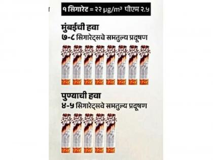 एका सिगारेटमधून साधारण २२ µg/m³ पीएम २.५ तयार होते. सध्या मुंबईतील पीएम २.५ पातळी १५०-१७० µg/m³ आहे आणि पुण्याची पातळी साधारण ८०-१०० µg/m³ आहे. म्हणजेच १ सिगारेट = २२ µg/m³ पीएम २.५ इतके.
