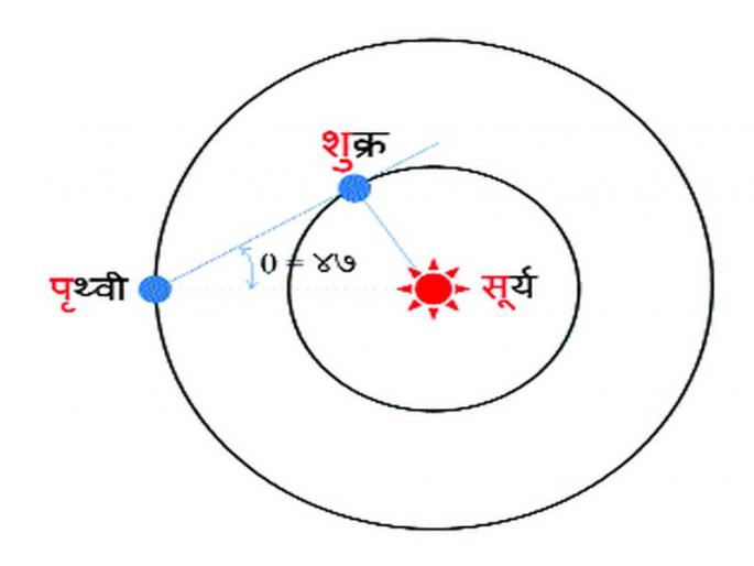 वरील चित्रात सूर्याभोवती पृथ्वी आणि शुक्र यांच्या कक्षा दाखविल्या आहेत. पृथ्वी आणि शुक्र यांना जोडणारी रेष शुक्राच्या कक्षेस स्पर्शिका आहे. म्हणजे पृथ्वी-शुक्र-सूर्य हा कटकोन किंवा ९० अंशाचा आहे आणि पृथ्वी-शुक्र-सूर्य हा कटकोन त्रिकोण झाला, तसेच शुक्र-पृथ्वी-सूर्य हा कोन अधिकतम आहे. हा कोन निरीक्षणातून मोजता येऊ शकतो.