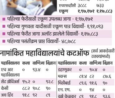 अलॉट झालेल्या जागांमध्ये विज्ञान शाखेच्या ४० हजार ३५४, कला शाखेच्या ११ हजार ७६८ आणि वाणिज्य शाखेच्या ६५ हजार ०२८ जागांचा समावेश आहे. एचएसव्हीसीच्या ७३३ जागांवर विद्यार्थ्यांना प्रवेश मिळाले. पहिल्या पसंतीचे महाविद्यालय मिळालेल्यांमध्ये विज्ञान शाखेच्या १९ हजार १०६ विद्यार्थ्यांचा समावेश आहे. वाणिज्य शाखेच्या २२ हजार ६०० आणि कला शाखेच्या सहा हजार ३९८ विद्यार्थ्यांना पसंतीचे पहिल्या क्रमांकाचे महाविद्यालय प्राप्त झाले आहे. पहिल्या गुणवत्ता यादीमध्ये प्रवेश मिळालेल्या मुलांची संख्या ५६ हजार ६१३, तर मुलींची संख्या ६१ हजार २६९ आहे.