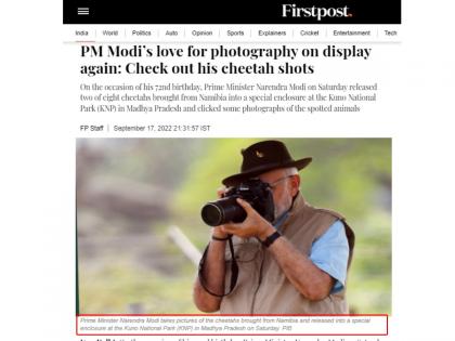 गुगलवर narendra modi photography cheetah असं किवर्ड सर्च केलं असता पहिलीच लिंक Firstpost वृत्तसंस्थेनं या कार्यक्रमात मोदींनी केलेल्या फोटोग्राफीच्या बातमीची आढळून आली. या बातमीसाठी वापरण्यात आलेला फोटो पंतप्रधान नरेंद्र मोदी फोटोग्राफी करतानाचा आहे. तसंच फोटोचं कॅप्शन पाहिलं असता फोटो पीआयबीनं टिपला असल्याचं दिसतं. महत्वाचं बाब म्हणजे लेन्सवरील कव्हर न काढता मोदी फोटोग्राफी करत असलेला व्हायरल झालेला फोटो आणि या बातमीतील फोटोची तुलना केली असता व्हायरल करण्यात आलेला फोटो रिव्हर्स करुन वापरण्यात आल्याचं दिसून येतं.