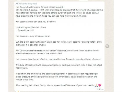 व्हॉट्सअॅपवर टाटा मेमोरियल हॉस्पीटलचे डॉ. राजेंद्र बडवे यांच्या नावाने फिरत असलेल्या मेसेजमध्ये नारळपाणी गरम करुन प्यायल्यानं कॅन्सरच्या पेशी मारल्या जातात असा सल्ला देण्यात आला आहे. "एका कपमध्ये नारळाचे पातळ खोबऱ्याचे २ ते ३ तुकडे घ्या. त्यात गरम पाणी घाला. मग तयार झालेले "क्षारयुक्त पाणी" दररोज प्या. हे सर्व वयोगटातील व्यक्तींसाठी आरोग्यदायी ठरतं. नारळाच्या गरम पाण्यामुळे कर्करोगावर प्रभावी ठरतो. ही पद्धत वैद्यकीय क्षेत्रात कर्करोगाच्या प्रभावी उपचारांमध्ये गुणकारी ठरत आहे. नारळाच्या गरम पाण्यानं सिस्ट्स आणि ट्यूमरवर परिणाम होतो. सर्व प्रकारच्या कर्करोगावर उपचार करण्यासाठी सिद्ध झालं आहे. नारळाच्या अर्कासह अशा प्रकारचे उपचार केवळ घातक पेशी नष्ट करतात, त्याचा निरोगी पेशींवर परिणाम होत नाही", असा दावा व्हायरल मेसेजमध्ये केला गेला आहे.