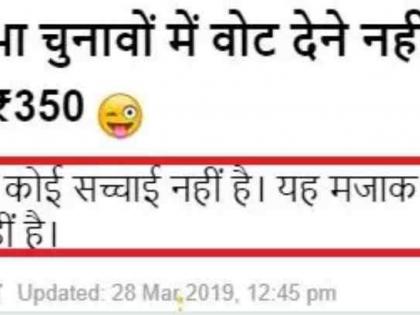 "हवाबाजी: तुम्ही लोकसभा निवडणुकीत मतदान करण्यासाठी न गेल्यास, तुमच्या बँक खात्यातून 350 रुपये कापले जातील" या शीर्षकासह प्रकाशित झालेल्या लेखाच्या खाली स्पष्ट शब्दात डिस्क्लेमर नोट आहे - "यात काहीही तथ्य नाही. ही बातमी केवळ एक विनोद आहे. यातून कोणतीही खोटी माहिती परवण्याचा किंवा दुखावण्याचा हेतू नाही."
