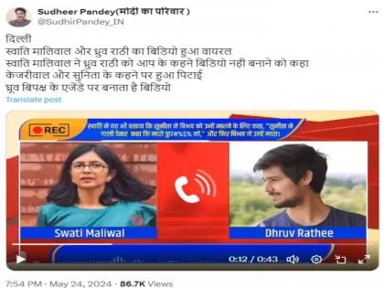 — Sudheer Pandey(मोदी का परिवार ) (@SudhirPandey_IN) May 24, 2024 " target="_blank">यूजरने लिहिले की, “दिल्ली, स्वाती मालिवाल आणि ध्रुव राठी यांचा व्हिडिओ व्हायरल झाला. स्वाती मालिवाल यांनी ध्रुव राठी यांना विनंती करून व्हिडिओ बनवू नका, असे सांगितले. केजरीवाल आणि सुनीता यांच्या सांगण्यावरून ही मारहाण झाली. ध्रुव विरोधकांच्या अजेंड्यावर व्हिडिओ बनवतो”, असे कॅप्शन दिले आहे. (अर्काइव्ह लिंक)