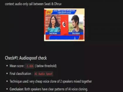 — Sudheer Pandey(मोदी का परिवार ) (@SudhirPandey_IN) May 24, 2024 " target="_blank">0:09 काउंटरवर स्वाती मालिवाल यांचा आवाज ऐकू येतो की, तिला अरविंद आणि सुनीता केजरीवाल यांच्यासमोर मारण्यात आले. या ऑडिओमध्ये एक जंप कट असल्याचे आढळून आले. यावरून आम्ही आयआयटी जोधपूरने तयार केलेले डीपफेक टूल इतिसार यावर या ऑडिओ क्लिपचे परीक्षण केले. यामध्ये डीपफेक ऑडिओ असल्याचा रिपोर्ट आला. आम्ही Contrails AI येथील संशोधकांना ऑडिओ क्लिप पाठवली. त्यांनी दुजोरा दिला की, दोन्ही व्यक्तींच्या आवाजात एआय व्हॉइस क्लोनिंगचे स्पष्ट पॅटर्न आढळून आला आहे. त्यांनी सांगितले की, व्हायरल कॉल ऑडिओ एक AI ऑडिओ स्पूफ (AI audio spoof) आहे.(सदर फॅक्ट चेक BOOM या वेबसाइटने प्रसिद्ध केलं आहे. 'शक्ती कलेक्टिव्ह'चा भाग म्हणून 'लोकमत डॉट कॉम'ने त्याचा अनुवाद केला आहे.)