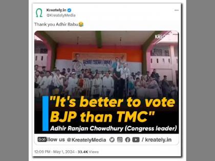 अधीर रंजन चौधरी यांच्या सध्या व्हायरल होणाऱ्या ८ सेकंदांच्या व्हिडीओमध्ये ते म्हणताना दिसतात की, तृणमूल काँग्रेसपेक्षा भाजपाला मत दिले तर चांगली गोष्ट आहे. तुम्ही भाजपाला मत देऊ शकता. भाजपाला मत देणे ही तृणमूलला मतदान करण्यापेक्षा कधीही चांगलीच बाब म्हणता येईल."