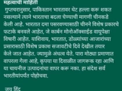 सोशल मीडियावर एक मेसेज व्हायरल होत आहे, 'गुप्तचर माहितीनुसार, पाकिस्तानभारतावर थेट हल्ला करू शकत नसल्याने त्याने भारताकडून बदला घेण्याची मागणी केली आहे. चीनने भारतात दमा पसरवण्यासाठी खास फटाके बनवले आहेत, जे कार्बन मोनोऑक्साइड वायूपेक्षाही विषारी आहेत.याशिवाय भारतात, डोळ्यांच्या आजारांच्या प्रसारासाठी विशेष प्रकाश सजावटीचे दिवे देखील तयार केले जात आहेत. ज्यामुळे अंधत्व येते. पारा मोठ्या प्रमाणाात वापरला गेला आहे. कृपया या दिवाळीत जागरुक रहा आणि या चायनीज उत्पादनांचा वापर करु नका. हा संदेश सर्व भारतीयांपर्यंत पोहोचवा, असं या मेसेजमध्ये म्हटले आहे. यामुळे चीनी फटाक्यांवर बंदीचे मेसेज व्हायरल झाले आहेत. या मेसेज मागीस सत्य केंद्राने सांगितले आहे.