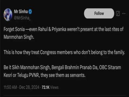 एक्सवर पोस्ट करत उजव्या विचारसरणीच्या युजरने म्हटलं की, "सोनिया गांधींना राहू द्या, मनमोहन सिंग यांच्या अंत्यसंस्काराला राहुल आणि प्रियंकाही उपस्थित नव्हते. काँग्रेसच्या कुटुंबातील नसलेल्या सदस्यांची हीच अवस्था आहे. शीख मनमोहन सिंग असोत, बंगाली ब्राह्मण प्रणव दा असोत, ओबीसी सीताराम केसरी असोत किंवा तेलुगु पीव्हीएनआर असोत, ते त्यांच्याकडे सेवक म्हणून पाहतात."