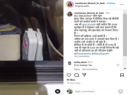 सोशल मिडिया वापरकर्ते ‘vandanaa_bharat_ki_beti’ ने व्हायरल व्हिडीओ (आर्काइव्ह लिंक) शेअर करत लिहिले की, "Big Breaking* खेल शुरू, काँग्रेसच्या लोकांनी झंडा चौक नागपुरात ईव्हीएम घेऊन जाणाऱ्या भाजपच्या लोकांना पकडले. आताही @ECISVEEP म्हणेल की EVM सुरक्षित आहे, हे पाहून आपण एवढेच म्हणू शकतो की उद्या महाराष्ट्र आणि झारखंडचे निकाल तयार आहेत. मतमोजणी प्रक्रिया अद्याप बाकी आहे. गुप्ता यांनी अमित यांच्या मनातील गोष्ट सांगितली आहे. राजीव यांनी यापूर्वीच त्याची अंमलबजावणी केली आहे. मोदी हैं तो EVM हैं. अजूनही वेळ आहे, EVM वर करडी नजर ठेवा नाहीतर हरयाणासारखाच निकाल बघाल.
