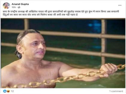 हा फोटो फेसबुकवर शेअर करताना एका व्यक्तीने म्हटलं की, “सपचे राष्ट्रीय अध्यक्ष श्री अखिलेश यादव यांनी सनातनी हिंदूंना सडेतोड उत्तर देताना कुंभमध्ये स्नान केले. आता सपाला सनातनी हिंदूंची सगळी मते मिळतील, बाबाजींनी अजून आंघोळ केलेली नाही.”