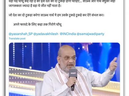 अमित शाह यांचा हा व्हिडिओ शेअर करत सोशल मीडियावर एका यूजरने म्हटलं आहे की, "एकीकडे श्री. अखिलेश आणि श्री. राहुल गांधी हे संपूर्ण देशाला एकत्र करत आहेत. हिंदू-मु्स्लीम-शीख-ईसाई या सर्व धर्मांना सोबत घेऊन चालत आहेत. मात्र ही व्यक्ती देशाचे तुकडे व्हायला हवेत, असं म्हणत आहे. दक्षिणेत जागृकता जास्त असल्याने हे लोकं जिंकू शकत नाहीत. जो देशाचे तुकडे करेल त्याचे आम्ही तुकडे करू. तुम्ही तुमच्या फायद्यासाठी किती पातळी सोडणार आहात?" असा सवाल करत सदर यूजरने अमित शाह यांचा व्हिडिओ शेअर केला आहे.