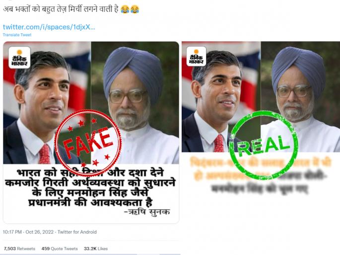 'अब भक्तों को बहुत तेज़ मिर्ची लगने वाली है' अशा कॅप्शनसह अनेक ट्विटर हँडलवरून २६ ऑक्टोबर रोजी एक फोटो शेअर करण्यात आला आहे. ऋषी सुनक आणि डॉ. मनमोहन सिंग या फोटोत दिसत आहेत. त्यासोबत, "भारत को सही दिशा और दशा देने कमजोर गिरती अर्थव्यवस्था को सुधारने के लिए मनमोहन सिंह जैसे प्रधानमंत्री की आवश्यकता है'', असं वाक्य ऋषी सुनक यांच्या नावाने देण्यात आलंय. फोटोवर 'दैनिक भास्कर'चा लोगो आहे. म्हणजेच, ऋषी सुनक यांनी मनमोहन सिंह यांचं कौतुक केल्याचा दावा करत, आता मोदी अन् भाजपा समर्थकांना मिरच्या झोंबतील, अशी टिप्पणी बऱ्याच ट्विटर युजर्सनी केली आहे.