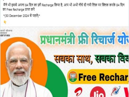 नवी दिल्ली - सोशल मीडियावर सध्या एक पोस्ट व्हायरल होत आहे. त्यात पंतप्रधान फ्री योजनेतून सर्व भारतीय युजर्सना ३ महिन्यासाठी फ्री मोबाईल रिचार्ज मिळत आहे. हा रिचार्ज ३० डिसेंबरपूर्वी करावा असा दावा करण्यात आला आहे. या पोस्टसोबत एक लिंक शेअर केली जातेय. ज्यावर क्लिक करून ८४ दिवसांचा फ्री रिचार्ज जाऊ शकतो असं मेसेजमध्ये सांगितले आहे.