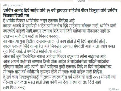 शिवसेनेचे दिवंगत नेते आनंद दिघे यांच्या जीवनावर आधारित 'धर्मवीर' चित्रपट मंत्री एकनाथ शिंदे यांनी स्वत:च्या मार्केटिंगसाठी केला असल्याचा दावा पोस्टमधून करण्यात आला आहे. संबंधित पोस्ट आनंद दिघे यांच्याकडे १२ वर्ष त्यांच्या कारचे ड्रायव्हर राहिलेल्या पीटर डीसुझा यांनी केल्याचं नमूद करण्यात आलं आहे. पीटर डीसुझा यांच्या नावे व्हॉट्सअॅपवर व्हायरल होणारी पोस्ट पुढीलप्रमाणे-