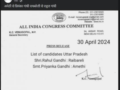 तर अमेठी लोकसभा या फेसबुक पेजने आणखी एक प्रेस रिलीज शेअर करून दावा केला आहे की प्रियंका गांधी यांना अमेठी लोकसभा मतदारसंघातून उमेदवार करण्यात आले आहे आणि राहुल गांधी यांना रायबरेली लोकसभा मतदारसंघातून उमेदवार करण्यात आले आहे.