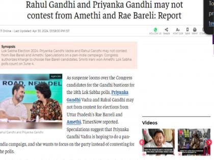 TimesNow च्या वृत्ताचा हवाला देत इकॉनॉमिक टाईम्सने बातमी दिली की, प्रियंका गांधी वाड्रा आणि राहुल गांधी कदाचित उत्तर प्रदेशातील रायबरेली आणि अमेठी लोकसभा मतदारसंघातून निवडणूक लढवणार नाहीत. प्रियंका गांधींना निवडणूक लढवण्याऐवजी संपूर्ण भारतभर काँग्रेसचा प्रचार करायचा आहे आणि पक्षावर लक्ष केंद्रित करायचे आहे असं बातमीत सांगितले आहे. येथे क्लिक करून संपूर्ण बातमी वाचा.