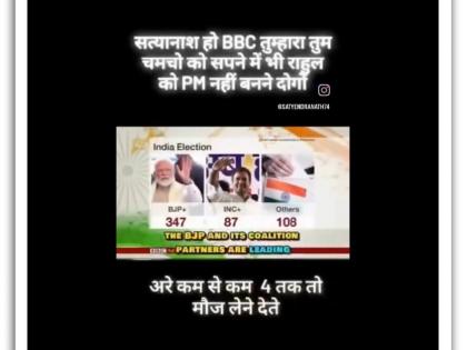 सोशल मीडिया यूजर्संच्या मते हा बीबीसीचा एक्झिट पोल आहे. व्हिडीओवर लिहिले आहे की, “सत्यानाश बीबीसी तुमच्या स्वप्नातही राहुल'ला पंतप्रधान होऊ देणार नाहीत, किमान ४ तारखेपर्यंत तरी एन्जॉय करू दिले असते'. असं या पोस्टमध्ये लिहिले आहे.