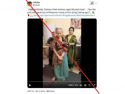 संबंधित व्हिडिओ खोटा असून डिसेंबर २०२२ मधील हा व्हिडिओ आहे. त्यातील महिला प्रसिद्ध अभिनेत्री वैजयंती माला नाही. पोस्टमध्ये करण्यात येत असलेला दावा चुकीचा आहे.