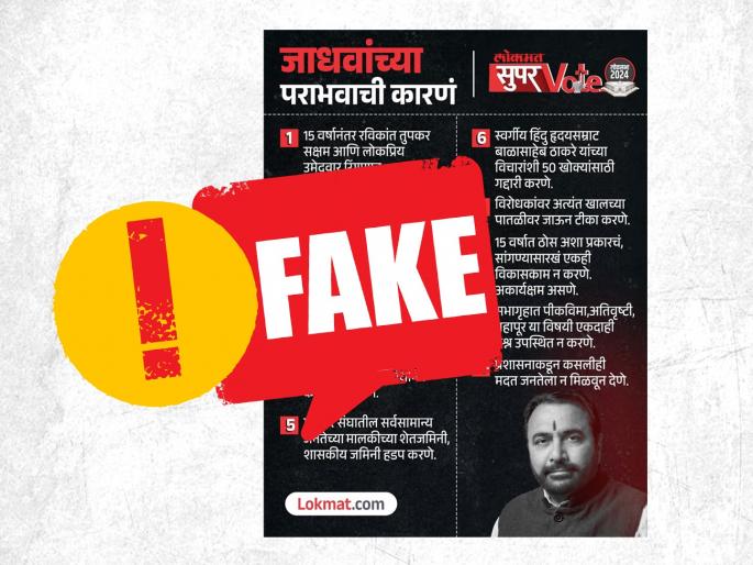 बुलढाणा मतदारसंघात महायुतीकडून शिवसेना - शिंदे गटाचे प्रतापराव जाधव रिंगणात उतरले आहेत. विजयाचा चौकार ठोकून इतिहास रचण्याचा त्यांचा इरादा आहे. तर, ठाकरे गटाने नरेंद्र खेडेकर यांना उमेदवारी दिली आहे. शेतकरी नेते रविकांत तुपकर यांनी अपक्ष उमेदवार म्हणून अर्ज भरल्यानं ही लढत तिरंगी झाली आहे. प्रचाराच्या अखेरच्या टप्प्यात सगळेच एकमेकांवर कुरघोडीचा प्रयत्न करत असताना, जाधव यांच्या विरोधातील एक क्रिएटिव्ह काही व्हॉट्सअप ग्रूपवर फिरवण्यात येतंय. 'जाधवांच्या पराभवाची कारणं' असं त्याचं शीर्षक असून त्यावर दहा मुद्दे आणि जाधवांचा फोटो आहे. धक्कादायक बाब म्हणजे, त्यावर 'लोकमत डॉट कॉम' आणि 'लोकमत सुपर व्होट'चा लोगो वापरण्यात आला आहे. हे क्रिएटिव्ह 'लोकमत'ने केल्याचं भासवून वाचकांची, मतदारांची दिशाभूल करण्याचा हा प्रकार आहे.