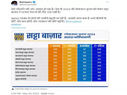 सोशल मिडिया प्लॅटफॉर्म 'एक्स'वर हे ग्राफिक शेअर करत एका युजरने लिहिले की,'देश बदलाकडे वाटचाल करत आहे. देशातील २०२४ च्या लोकसभा निवडणुकीच्या सट्टेबाजीने भाजप नेत्यांची झोप उडवली आहे. इंडिया आघाडीकडून लोकांच्या अपेक्षा वाढत आहेत, शेवटचा टप्पा बाकी आहे, भाजपच्या जागा आणखी कमी होतील आणि युतीच्या जागा वाढतील.#FilmyModi #INDIA.