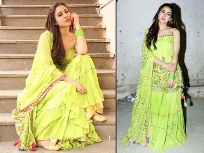 लाइम ग्रीन कलरचा शरारा आणि कुर्ती सेट सुकृती आणि आकृती यांनी डिझाइन केला होता. जो लग्नातील मेहंदीच्या फंक्शनसाठी बेस्ट लूक आहे. शरारासोबत साराने परिधान केलेल्या कुर्त्यावर सुंदर फ्लोरल एम्ब्रॉयडरी केली आहे. त्याचबरोबर मॅचिग कलरचा दुपट्टा वेअर केला असून त्यावर गोल्डन डॉट्स आहेत. सारा या लूकमध्ये फार क्युट दिसत आहे.