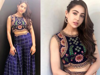 एमटीव्हीचा रियॅलिटी शो एस ऑफ स्पेसमध्ये सारा केदारनाथच्या प्रमोशनसाठी गेली होती. यादरम्यान साराने नेवी ब्लू कलरचा प्लाझो वेअर केला होता. ज्यावर व्हाइट कलरचे स्क्वेअर्स तयार करण्यात आले होते आणि मॅचिंग क्रॉप टॉप ज्यावर फ्लोरल वर्क केला होता. या इंडो वेस्टर्न लूकमध्ये ती फार गोड दिसत होती.