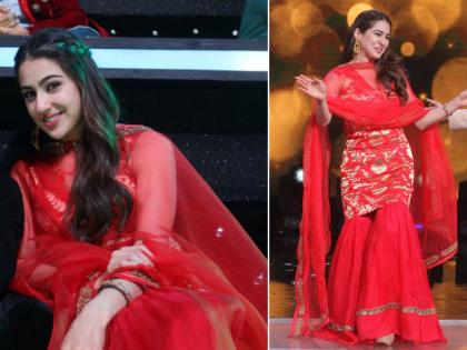 टीव्हीवरील रियॅलिटी शो 'सारे गा मा पा'च्या सेटवर केदारनाथच्या प्रमोशनसाठी पोहोचलेली सारा अली खान रेड कलरचा शरारा आणि कुर्त्यामध्ये दिसून आली. रॉ मॅन्गोद्वारे डिझाइन करण्यात आलेला रेड ब्रोकेड शरारा लग्नाआधी होणाऱ्या संगीत किंवा मेहंदीसाठी परफेक्ट आहे.