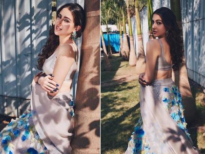 सिल्वर आणि ग्रे कलरचा हा लेहेंगा ज्यावर ब्ल्यू कलरने फ्लोरल वर्क करण्यात आले आहे. प्रसिद्ध डिझायनर अबू जानी संदीप खोसलाने डिझाइन केलेला आहे. साराचा हा लेहेंगा फार सुंदर असून सारा यामध्ये सुंदर दिसत आहे. हा लेहेंगा नातेवाईकांच्या लग्नामध्ये किंवा मैत्रिणीच्या लग्नामध्ये वेअर करण्यासाठी परफेक्ट आहे.