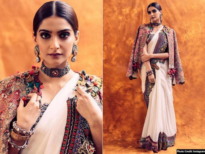 सोनम कपूरच्या लूकबाबात बोलायचे झाले तर तिने फॅशन डिझायनर अनामिका खन्नाच्या कलेक्शनमधील व्हाइट साडी परिधान केली होती. ज्या साडीची बॉर्डर सर्वांचं लक्षं वेधून घेत होती. सोनचा हा लूक फेस्टिव्ह सीझनसाठी तुम्हीही कॅरी करू शकता.