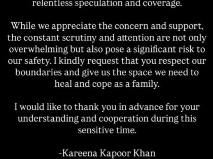 करिना कपूर पुढे लिहिते की, तुम्हा सगळ्यांना असलेल्या काळजीचा आम्हाला जाणीव आहे. ज्या प्रकारे तुम्ही सातत्याने अपडेट मिळवण्याचा प्रयत्न करता आहात ते पाहणं आमच्यासाठी खूप मोठी गोष्ट आहे. आमच्या सुरक्षेसाठी तुम्ही लोक ज्या पद्धतीने चिंतीत आहात, तिही खूप मोठी गोष्ट आहे. मात्र मी तुम्हा सर्वांना विनंती करू इच्छिते की, आमच्या मर्यादांचा मान ठेवा, आम्हाला थोडा अवकाश द्या, त्यामुळे आमचं कुटुंब या प्रसंगातून सावरू शकेल, अशी विनंतीही करिना कपूर हिने केली.