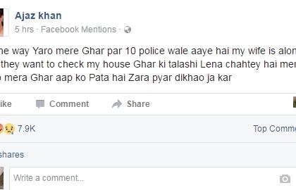 बुधवारी रात्री एजाजने फेसबुकवर एक व्हिडीओ शेअर करून खळबळ उडवून दिली. ""मी आता शूटींगसाठी बाहेर आहे. घरी माझी बायको आणि मुलगा दोघेच आहेत, आणि आता माझ्या घरी 10 ते 12 पोलिस पोहोचले, तुमच्या घराची झडती घ्यायची आहे कारण तुमच्या घरात अंमलीपदार्थ आहेत असं ते म्हणाले, त्यांच्याकडे कोणतंही वॉरंट नसताना त्यांनी घराची झडती घेतली. आता हे लोकं माझ्या घरात अंमलीपदार्थ ठेवून मला अडकवायचा प्रयत्न करत आहेत. माझ्या चाहत्यांना विनंती करतो की माझ्या घराखाली जमा व्हा, तुम्हाला माहितीये माझं घर कुठे आहे. दाखवून द्या त्यांना मी एकटा नसून तुम्ही सर्व माझ्यासोबत आहात. वा... बीजेपी सरकार...वा"" असं तो या व्हिडीओत बोलत आहे.