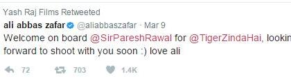 टायगर जिंदा है चित्रपटातील सलमान खानच्या लूकची चर्चा रंगत असताना परेश रावलच्या एन्ट्रीमुळे चित्रपटाच्या चर्चेत आता आणखी भर पडली आहे. बॉलिवूडमध्ये अनेक भूमिका सक्षमपणे पेलणाऱ्या परेश रावल यांच्यासोबत काम करण्यासाठी त्रपटाच्या दिग्दर्शक अब्बास जफर देखील उत्सुक आहे. परेश रावलच्या अभिनयाचा चाहता असल्याचे सांगत अब्बास जफरने परेश यांच्यासोबत काम करण्यासाठी आतुर झाल्याचे सांगितले. यापूर्वी 2011 मध्ये रेडी चित्रपटात परेश रावल आणि सलमान खान एकत्र दिसले होते. सलमानसोबतच्या या चित्रपटात विनोदी भूमिका साकरणारा परेश रावल आगामी चित्रपटात कोणत्या भूमिकेत असणार आहे हे पाहणे उत्सुकतेचे ठरेल.