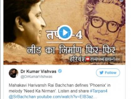 कुमार विश्वास तर्पण नावाने आपल्या कार्यक्रमात सादर केलेल्या कवितांचा व्हिडिओ युट्युबवर अपलोड करतात. 8 जुलै रोजी कुमार विश्वास यांनी हरिवंश राय बच्चन यांची कविता सादर केलेला व्हिडिओ युट्युब आणि ट्विटरवर अपलोड केला होता.
