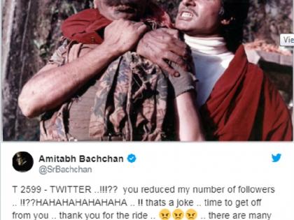 बुधवारी रात्री अमिताभ यांनी ट्विट करून आपली नाराजी बोलून दाखवली. रात्री ११.३५ वाजता त्यांनी ट्विट केले आणि सगळ्यांनाच धक्का बसला. ‘ट्विटर, आपण माझ्या फॉलोअर्सचा आकडा कमी केलात? ही गंमत आहे का? निरोप घेण्याची वेळ आता आलीयं. आत्तापर्यंतच्या प्रवासासाठी आभार,’ असे त्यांनी लिहिले. दुस-या सोशल मीडिया प्लॅटफॉर्मचा उल्लेख करत त्यांनी पुढे लिहिले की, ‘या समुद्रात आणखीही अनेक मासे आहेत आणि जे अधिक रोचक आहेत.’ यावेळी अमिताभ यांनी ट्विटरवर त्यांचे फॉलोअर्स घटवण्याचा आरोपही केला. आता अमिताभ यांच्या मनात नेमके काय आहे, ते माहित नाही. हे ट्विट त्यांनी गमतीत केलेले आहे की, ट्विटर सोडण्याबद्दल ते खरोखरीच गंभीर आहेत, हे लवकरच स्पष्ट होईल.
