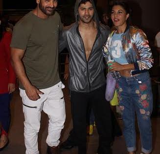 ढ शूम चित्रपटाच्या प्रदर्शनासाठी निघालेल्या जॉन अब्राहम, वरुण धवन आणि जॅकलिन फर्नांडीस यांचे मुंबई विमानतळावर घेतलेले छायाचित्र.