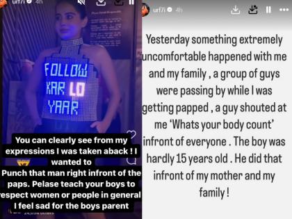 उर्फी जावेदसोबत काल विचित्र प्रकार घडला आहे. उर्फीने आलेला अनुभव सोशल मीडियावर शेअर केलाय. उर्फी लिहिते, "काल मी आणि माझ्या कुटुंबासोबत अत्यंत वाईट गोष्ट घडली. पापाराझी माझं फोटोशूट करत होते. त्याचवेळी बाईकवर असणारा एक मुलगा तिथून जात होता. त्या मुलाने मला विचारलं तुझं बॉडी काऊंट काय आहे?. अवघ्या १५ वर्षांचा तो मुलगा होता. माझ्यासोबत त्यावेळी माझं कुटुंब आणि आईही सोबत होती.