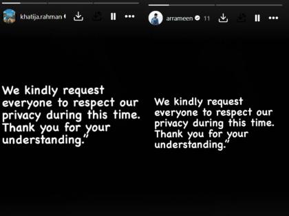 ए आर रहमान आणि सायरा बानो यांना दोन मुली आणि एक मुलगा आहे. खातिजा रहमान, रहीमा रहमान आणि ए आर अमीन अशी त्यांची नावं आहेत. खातिजा रहमानही वडिलांच्या पावलावर पाऊल ठेवत संगीतक्षेक्रात आली आहे. तिने वडिलांच्या एका अल्बममध्ये गाणंही गायलं. दरम्यान अमीन आणि खातिजाने इन्स्टाग्रामवर स्टोरी शेअर करत लिहिले,"याक्षणी आम्हाला प्रायव्हसी द्यावी ही विनंती. तुम्ही समजून घेत आहात यासाठी आभारी आहे."