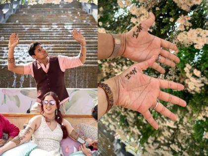 आयराच्या हातावर आता नुपूरच्या नावाची मेहंदी रंगली आहे. आयरा पांढऱ्या रंगाच्या आऊटफिटमध्ये अगदी सुंदर दिसत आहे. तर आयराच्या मागे नुपूर शिखरे उभा असलेला दिसत आहे. दोघांच्या हातावर 'आय अर्था आयरा आणि एन अर्थात नुपूर' (I & N) असं मेहंदीने लिहिलेलं दिसत आहे.
