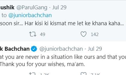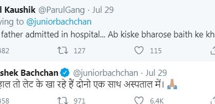 ‘बाप अस्पताल में भर्ती है, अब किसके भरोसे बैठकर खाओगे?’ या ट्रोलरला अभिषेकने मजेशीर उत्तर दिले. ‘फिलहाल तो लेटकर खा रहें हैं दोनो एक साथ अस्पताल में,’ असे उत्तर अभिषेकने दिले. मात्र अभिषेकच्या या उत्तरावर युजरचे समाधान झाले नाही. ‘गेट वेल सून सर. हर किसी के किस्मत में लेट कर खाना कहां?’अशा शब्दांत युजरने अभिषेकला पुन्हा डिवचण्याचा प्रयत्न केला. मात्र अभिषेकने यावरही अतिशय नम्र शब्दांत उत्तर दिले.