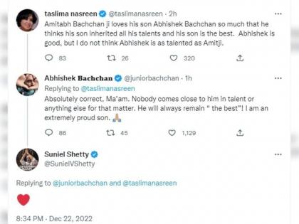 तस्लीमा यांच्या या ट्वीटला अभिषेकनं अगदी विनम्र शब्दांत पण कडक उत्तर दिलं. त्याने लिहिलं, ‘मॅडम, तुम्ही अगदी खरं बोललात. कोणीच त्यांच्या प्रतीभेची वा अन्य गोष्टीची बरोबरी करू शकत नाही. ते सर्वश्रेष्ठ आहेत आणि कायम असतील. मी त्यांचा मुलगा आहे, याचा मला अभिमान आहे.’