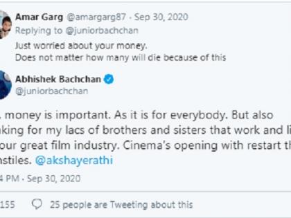 केवळ आपल्या पैशांची चिंता आहे. यामुळे किती लोकांचा जीव धोक्यात येईल, याची जराही चिंता नाही, असे एका युजरने लिहिले. यावरही अभिषेकने उत्तर दिले. ‘हो, पैसा महत्त्वाचा आहेच. पण मी त्या लाखोंची चिंता करतो, जे आमच्या इंडस्ट्रीत काम करतात आणि येथून पैसा कमावतात,’ असे अभिषेकने लिहिले.