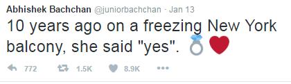 अभिषेक बच्चनने शुक्रवारी रात्री ट्विट क रून सांगितले, ‘‘ १० वर्षांपूर्वी न्यूयॉकमधील एका थंड बालकनीमध्ये ती हो म्हणाली होती.’’